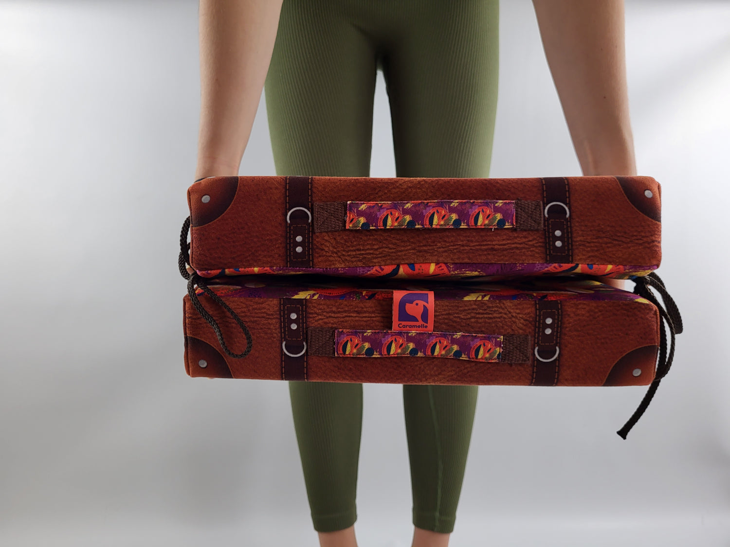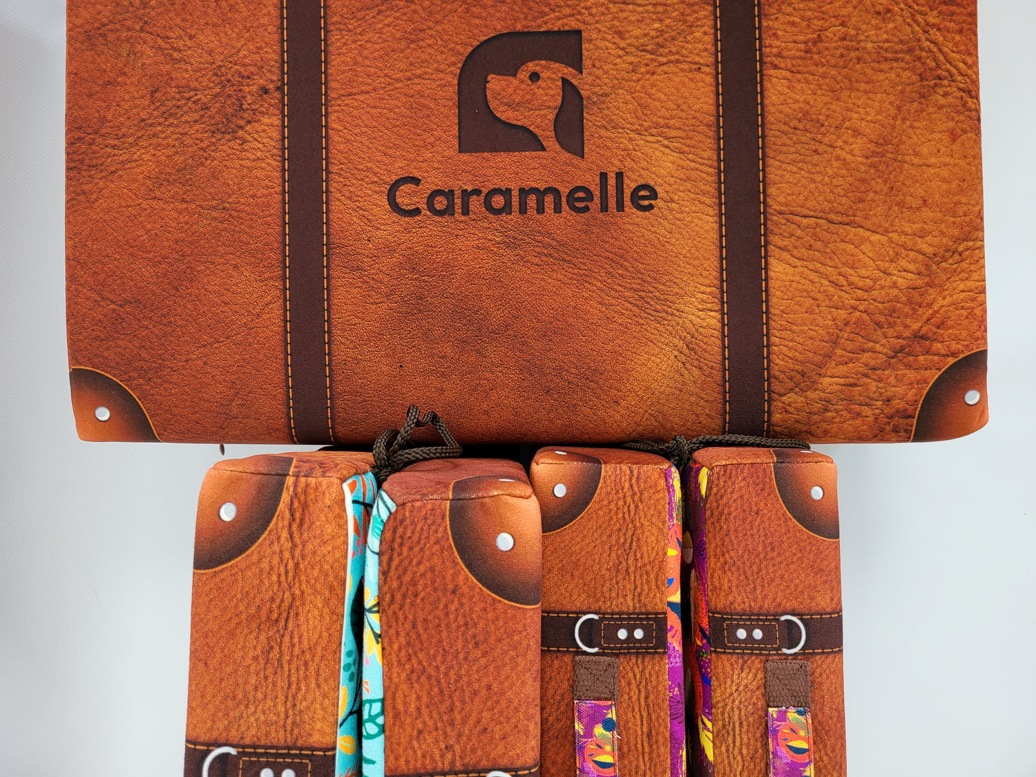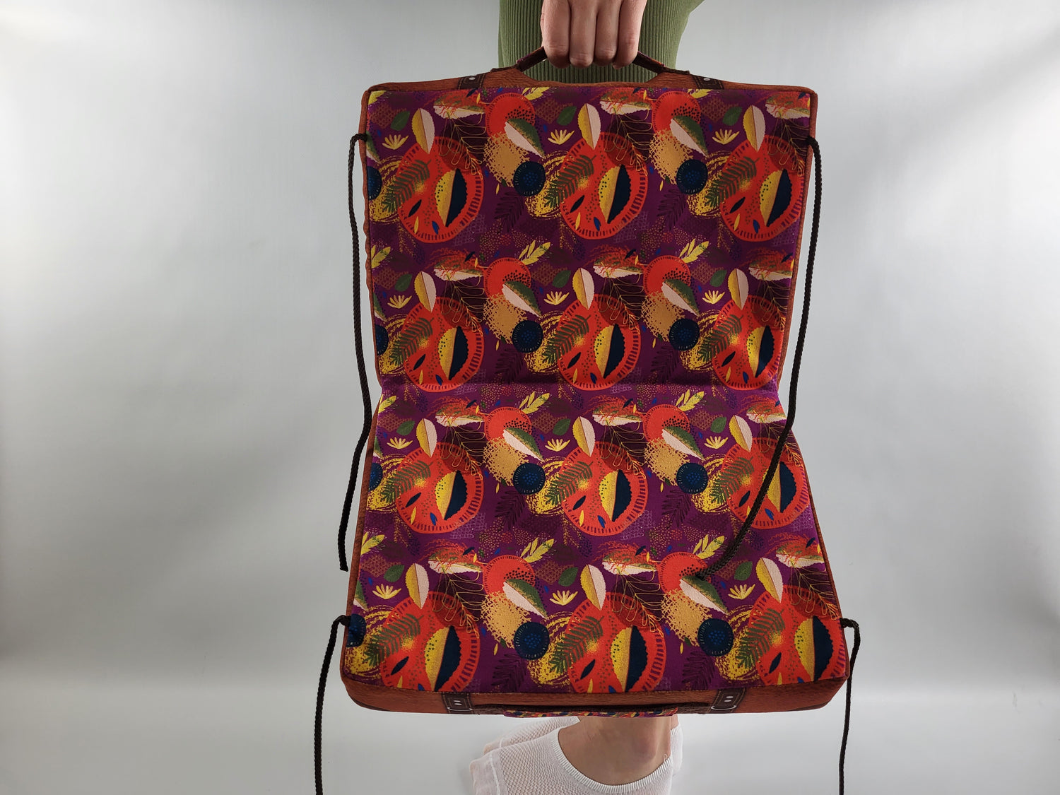 The carrying handles match the inner fabric of the case. The two side ties allow the case to be opened and closed with just a snap of the fingers.
